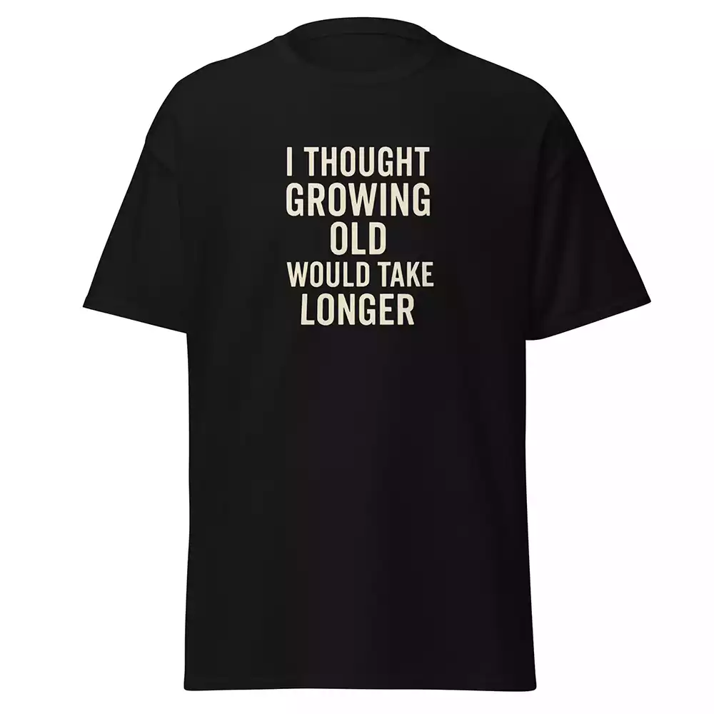 This is a black unisex t-shirt for people who blinked and suddenly found themselves older than they ever imagined being. Off-white text capturing the universal surprise at how quickly youth became a memory.