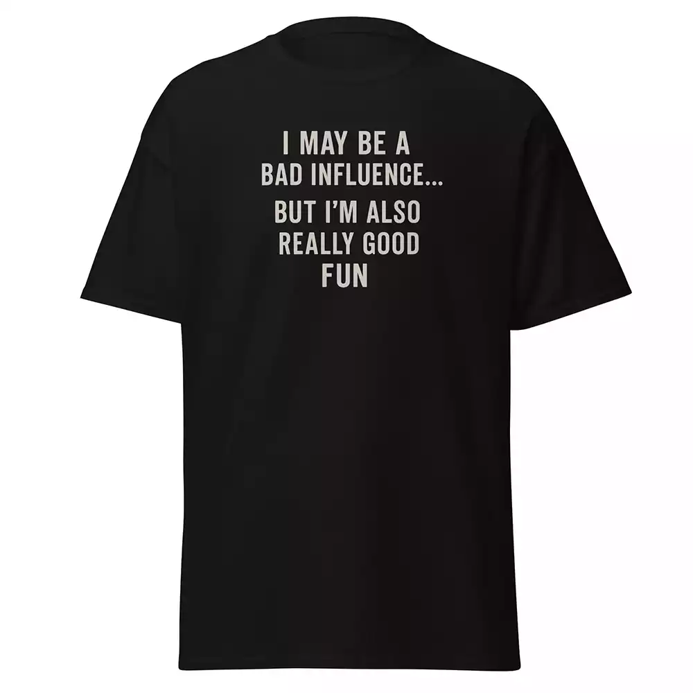 This is a black unisex t-shirt for people who acknowledge they’re not the responsible friend but promise legendary stories. Off-white text admitting that questionable decisions and good times are a package deal.