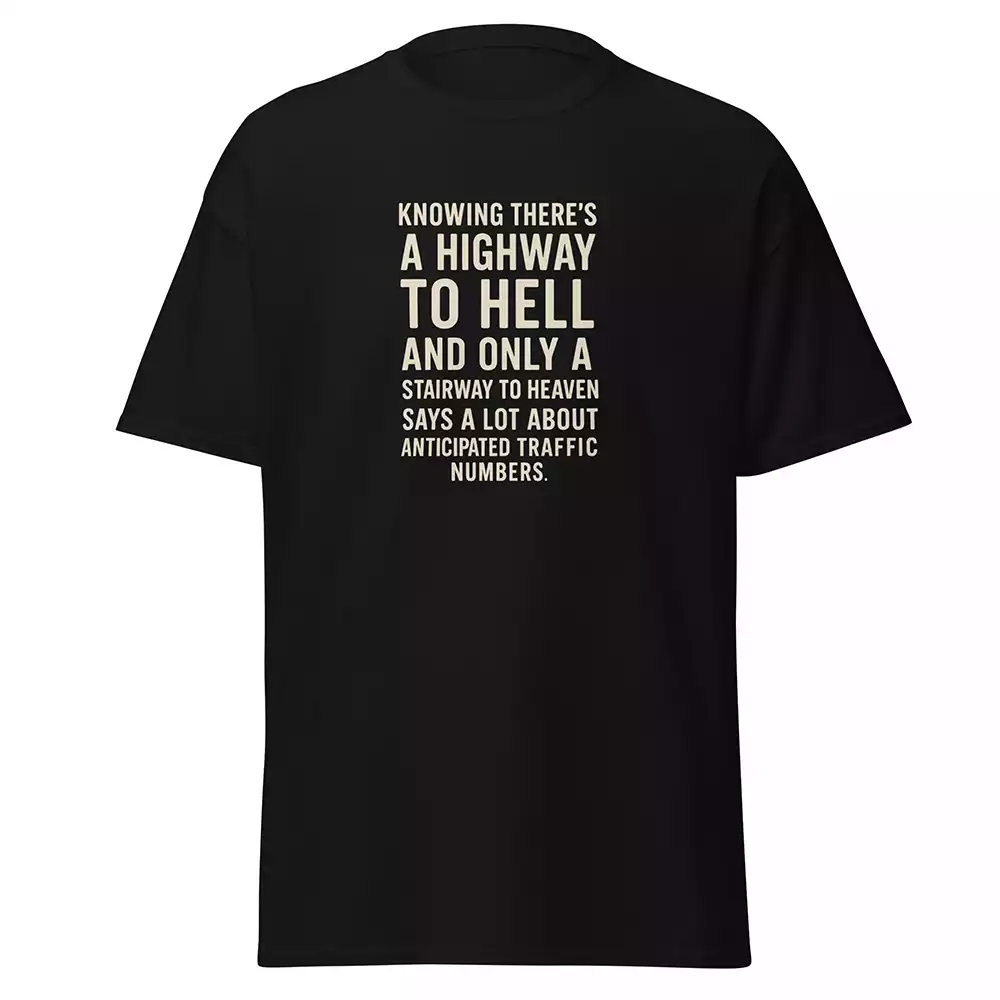 Black unisex t-shirt with off-white text reading "KNOWING THERE'S A HIGHWAY TO HELL AND ONLY A STAIRWAY TO HEAVEN SAYS A LOT ABOUT ANTICIPATED TRAFFIC NUMBERS." – funny sarcastic graphic tee