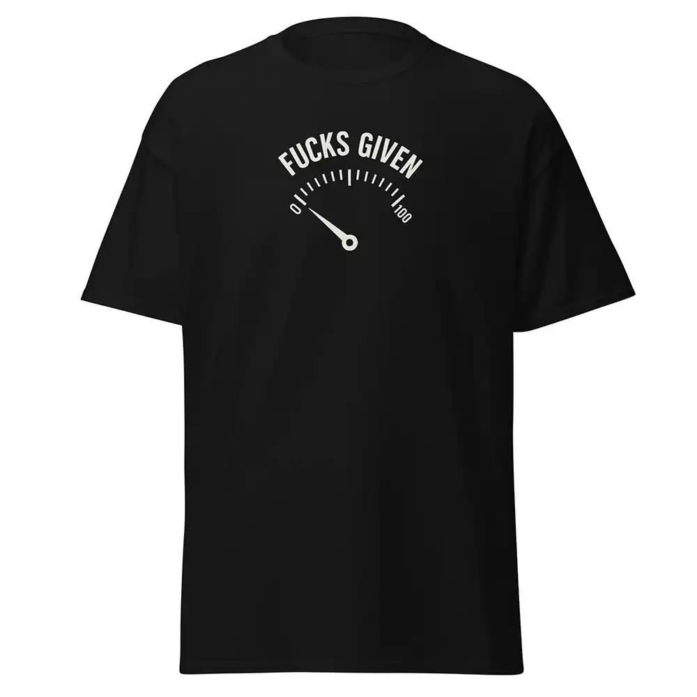 Black unisex t-shirt with off-white "FUCKS GIVEN" text and gauge graphic showing zero – funny sarcastic graphic tee