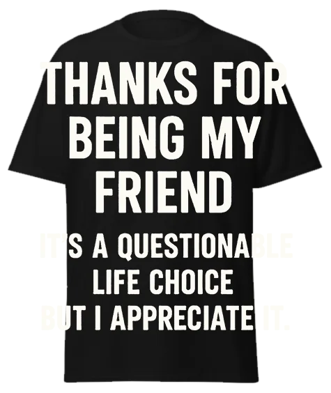 This is a black unisex t-shirt for people who know they’re a lot to handle and are grateful someone signed up for it anyway. Off-white text expressing appreciation while acknowledging that befriending you requires questionable judgment.