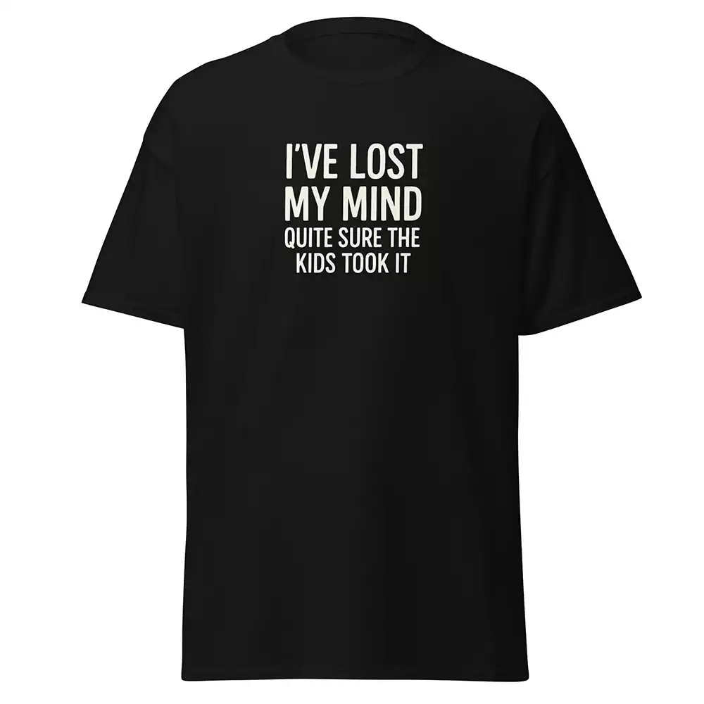 This is a black unisex t-shirt for parents who can’t remember what day it is, where they parked, or what they came into this room for. Off-white text documenting the theft of cognitive function by small humans.
