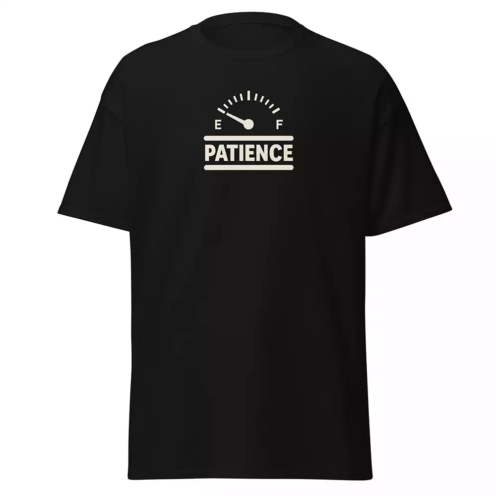 This is a black unisex t-shirt for people whose patience tank has been empty for months and are now running on fumes, spite, and caffeine. Off-white graphic showing exactly where their tolerance level sits.