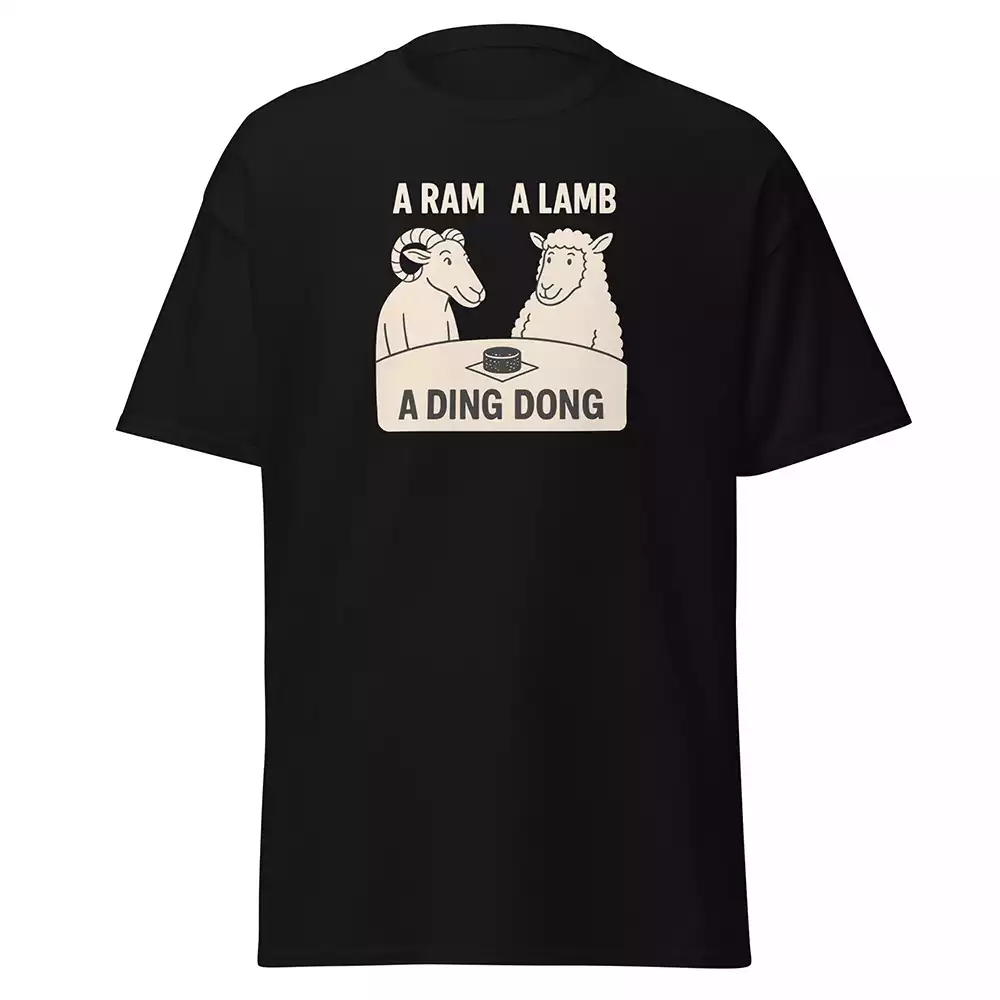 This is a black unisex t-shirt for people who appreciate puns so ridiculous they transcend comedy and become art. Off-white graphic showing a ram and lamb contemplating a doorbell in service of linguistic brilliance.