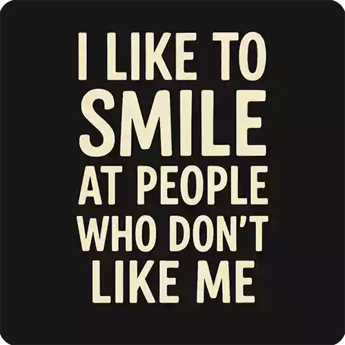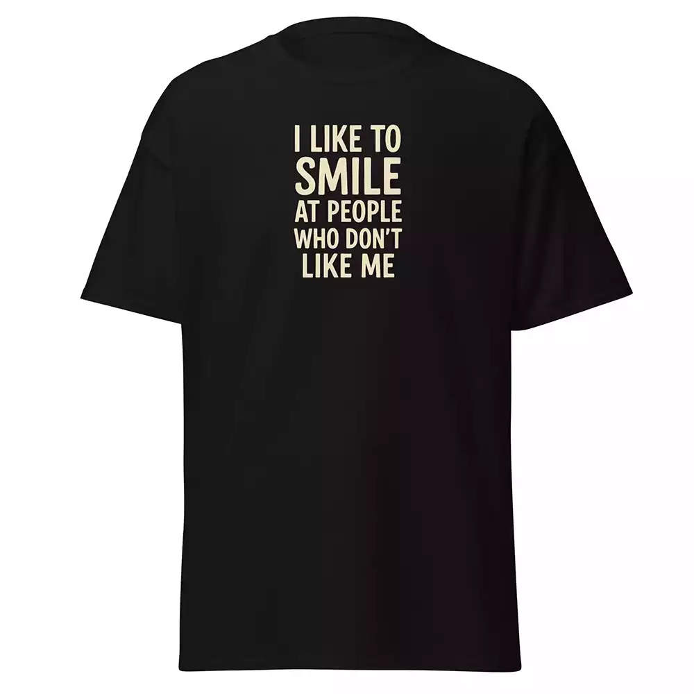 This is a black unisex t-shirt for people who turn passive aggression into an art form. Features the slogan ‘I Like To Smile At People Who Don’t Like Me’ in off-white text.